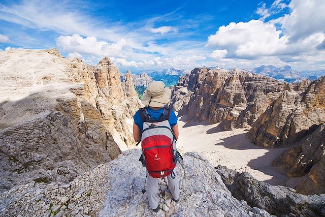 Une étape mythique au milieu des aiguilles, tours et autres sommets. Traversée jusqu'au col de Lavaredo, sous les Tre Cime. Tour du mont Paterno et de la Croda Passaporto, traversée près des lacs di Cengia, et col Pian di Cengia, au cœur des aiguilles dolomitiques. Retour ensuite au refuge d’Auronzo en faisant le tour par les faces nord des Tre Cime, sous les barres du Zinnenkopf et par le col de Medo. Une journée en forme d’apothéose !