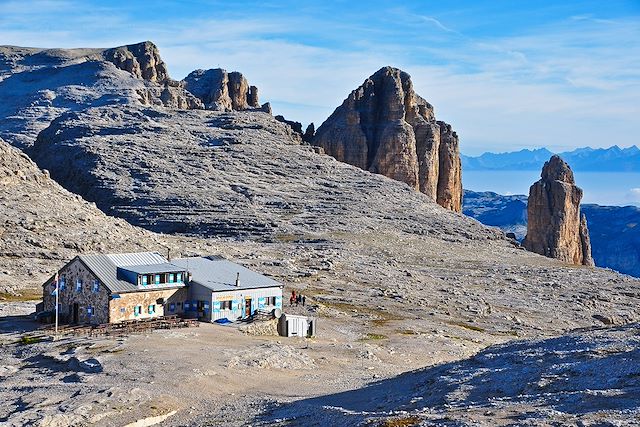 Une superbe étape qui vous conduira face aux mythiques Tre Cime de Lavaredo ! Vous passerez le Strudelsattel (2200m), avant de descendre par un superbe itinéraire dans la vallée di Landro, à 1406m. Vous remonterez la vallée de la Rienza en direction des Tre Cime, puis la vallée de Rin Bianco, pour parvenir au terme d’une étape haute en couleur au refuge du lac Antorno (1866m) ou au refuge Auronzo (2320m). Durant toute la première partie de la journée, vous croiserez çà et là de nombreux vestiges de la frontière fortifiée, construites à la fin du XIXe siècle par l’empire austro-hongrois à sa frontière avec l’Italie.