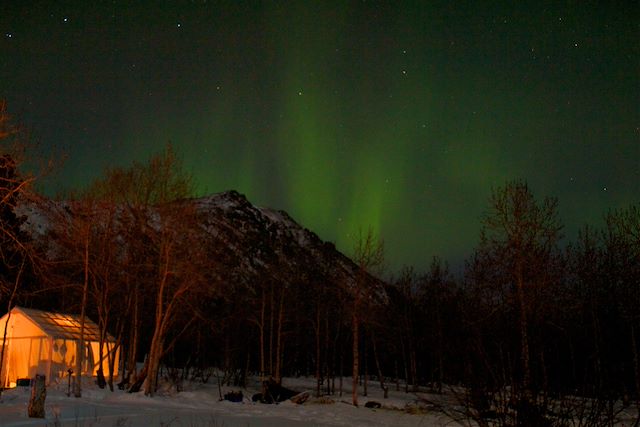 2 nuits pendant le raid, sous haute tente de prospecteur pré-montée avec un plancher en bois isolant, des bat-flancs avec matelas, chauffée au poêle à bois (pas de douche ni sauna).