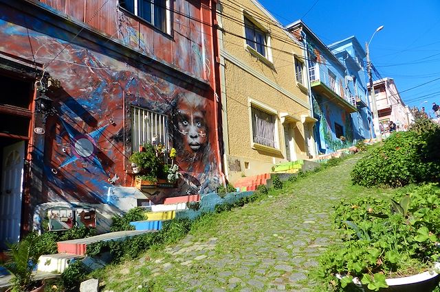 Très tôt nous partons pour l'aéroport afin de prendre un vol pour Santiago et continuons en descendant progressivement la route jusqu’au Pacifique, serpentant dans les vallées fertiles et viticoles. Valparaiso nous accueille, soit dans la Baguada, la brume marine si fréquente, soit sous un soleil radieux inondant la baie au bleu profond. Dans tous les cas, c’est avec le cœur que “El Puerto“ vous offre de déambuler dans ses rues pittoresques du Plan (la partie basse de la ville) ou dans ses Cerros (collines qui forment l’amphithéâtre de la ville). Les Cerros Concepcion et Alegre sont classés au patrimoine mondial par l’Unesco depuis 2003. Les poèmes et les romans nous ont raconté la ville, les marins et les artistes nous ont chanté ou peint sa vie, sa grandeur et le mythe de Valparaiso. Même en une journée, Valparaiso fascine.