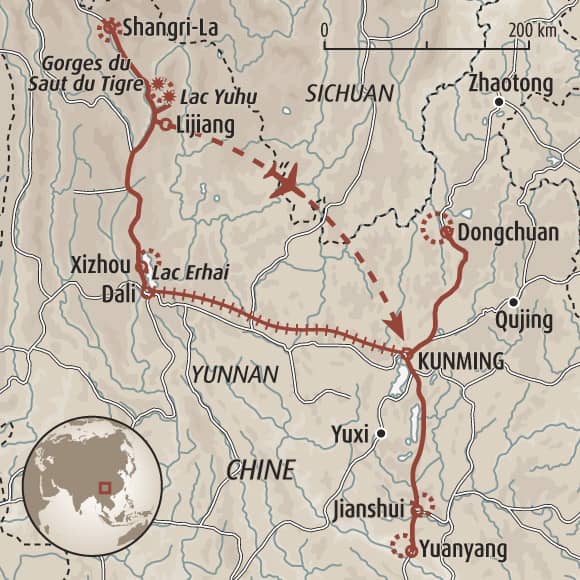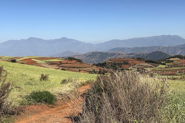 Aux confins sud-ouest de la Chine, le Yunnan est un trait d'union entre les basses terres fertiles et les contreforts du Tibet. Il offre un terrain de jeu idéal pour des aventures accessibles dans une myriade de paysages aux noms évocateurs. Nos randonnées nous mènent des Terres Rouges de Dongshuan aux légendaires rizières de Yuanyang, véritables "miroirs du ciel". Le fleuve Jinshajiang dévale les gorges du Saut du Tigre, dominées par les sommets enneigés tels que le Mont du Dragon de Jade. Nous partons à la rencontre des peuples minoritaires de la région : les Bai qui fabriquent la teinture à l'indigo, ou encore les Naxi et leurs villages en pierre. Un parfum de spiritualité imprègne notre périple, tant au temple de Confucius à Jianshui, qu'au monastère de Songzanlin à Shangri-La.