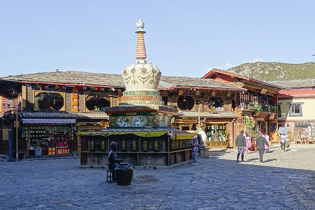 En début de matinée, nous flânons dans les ruelles anciennes de Dali, berceau du royaume de Nanzhao. avant un transfert vers le lac de Yuhu, au pied du mont du Dragon de Jade, point de départ de notre randonnée à travers prairies ondulantes et pins nains, où la montagne se dévoile majestueuse à chaque pas. A l'arrivée au village de Yuhu, les sentiers des prairies se transforment en petites ruelles pavées. Les pas résonnent sur la pierre des ruelles bordées de maisons Naxi aux murs épais, restaurées selon des techniques anciennes. Nous flânons dans ce village vivant, entretenu mais authentique, où la tradition subit une évolution douce sans perdre ses racines.
