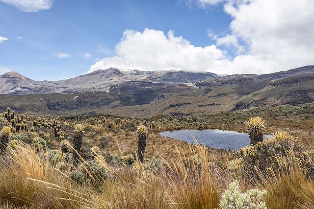 Le matin, montée jusqu’au pied du volcan Nevado del Ruiz (5321m), l'un des plus actifs du pays (1h30 de trajet). Plusieurs arrêts en chemin, notamment pour apercevoir la Laguna Negra (3900m) et les frailejones (4000m), les plantes endémiques des paysages d’altitude colombiens (páramo). En fonction de l’activité volcanique, l’accès peut être restreint ou interdit. Il est actuellement jusqu’à la vallée dite "vallée des tombes" à 4450m. Quand le temps est dégagé, belle vue sur le volcan dont les neiges éternelles sont parfois recouvertes de cendres.