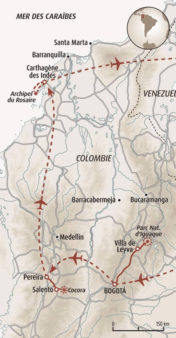 Depuis Bogota, capitale et centre culturel de la Colombie niché dans les Andes, vous rejoignez le paisible village colonial de Villa de Leyva. L'aventure prend une autre dimension, à pied sous les immenses palmiers de cire de la Vallée de Cocora. Enfin, vous accédez à l'ambiance unique des Caraïbes à Carthagène des Indes, sa gastronomie et ses plages de sable blanc.