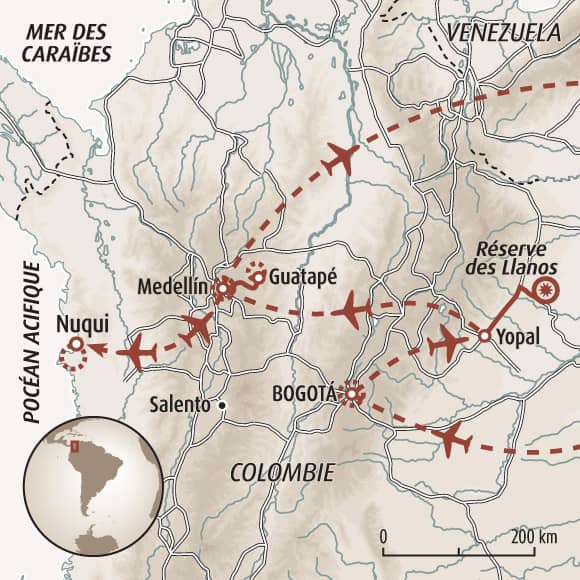 La Colombie abrite 10% de la faune et de la flore mondiale, une nature exceptionnelle notamment pour les espèces d'oiseaux et d'orchidées. Le voyage vous invite à découvrir cette spectaculaire biodiversité depuis les vastes plaines orientales des Llanos, lieu de prédilection des jaguars, fourmilliers géants, capybaras et anaconda. Une parenthèse citadine à Medellin vous permet de visiter cette ville dynamique et moderne loin des clichés. L'aventure se termine par un pur moment de déconnexion entre la jungle du Choco et l'Océan Pacifique.