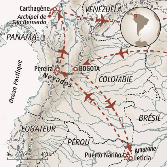 Mosaïque de paysages, diversité des écosystèmes, vous vivez une véritable immersion dans trois zones exclusives de Colombie : l'Amazonie, la Cordillère des Andes et la côte Caraïbes. Votre programme commence dans la forêt tropicale d'Amazonie au milieu de sa flore exubérante et sa faune sauvage. Changement de décor, vous séjournez dans une magnifique finca de la Région du Café pour vous ressourcer avant de vivre le farniente caribéen au large de Carthagène.