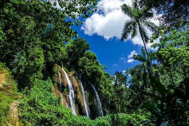 Nous quittons la belle Trinidad et refermons la parenthèse urbaine pour retrouver la nature cubaine, cette fois-ci dans le massif de la Sierra del Escambray. Lle bus avance doucement à mesure que la route serpente gentiment, dans un paysage verdoyant. Après 45 minutes de bus, nous changeons de véhicule et montons dans un camion militaire, dorénavant utilisé pour le tourisme local. Et après 45 minutes de grandes vibrations, nous voici au point de départ de la balade du jour, sur un sentier du parc naturel de Guanayara. Nous marchons dans la forêt, à l'ombre, guidés par un local qui nous montre la flore du coin. En chemin, nous croisons des cascades et un bassin d'eau bleu-vert, dans lequel nous pouvons nous rafraîchir. Enfin, après avoir traversé un long pont suspendu, au-dessus du río melodioso, nous atteignons la maison de la Galicienne pour le déjeuner. Dans l'après-midi, nouveau transfert en camion militaire puis en bateau sur le lac Hanabanilla, le plus grand lac de Cuba. Nous débarquons à Río Negro, un lieu charmant et reculé, doté de petites paillottes et de toilettes, où nous allons poser nos matelas pour une nuit en bivouac. Temps libre pour se baigner dans le lac ou monter au belvédère pour une vue à 360 degrés, et dîner. Nous sommes seuls au monde, en pleine nature.