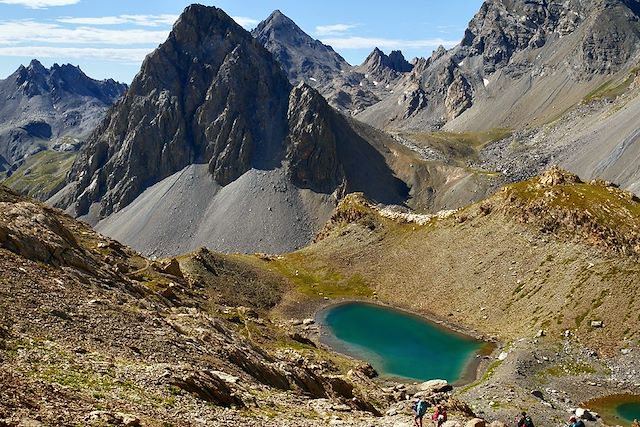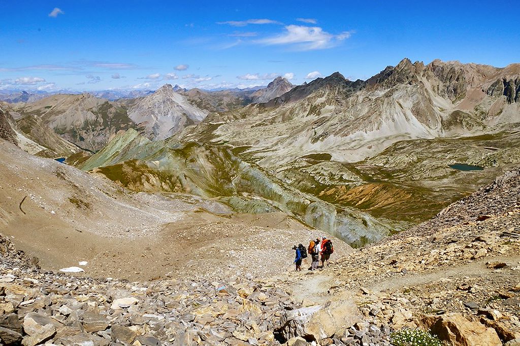 Après la nuit dans le refuge du Chambeyron, au pied de cet imposant massif, départ à la conquête d'une série de cols franco-italiens, tous aussi atypiques les uns que les autres. Après un passage au lac des 9 couleurs, montée au col de la Gypière (2927m) frontalier avec l'Italie. Belle traversée en balcon sur les lacs de la Finestra pour rejoindre le Colle dell Infernetto. Ce passage en schiste meuble sera propice à des "tout droit" pour rejoindre en contrebas les Laghi dell Infernetto. Vous aurez pu apercevoir au passage le sentier improbable de Monte de Ciaslaras (3000m), non pas vertigineux, mais très pentu. Descente en pierrier, au milieu de névés (neiges souvent éternelles) jusqu'aux magnifiques lacs Marinet. Arrivée à Maljasset par le large vallon de Mary. Nuit avec les bagages.