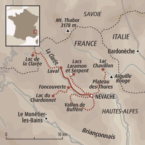 L’alpage des Thures permet le passage sur la Vallée étroite enclave névachaise en Italie. La montée forestière s’effectue progressivement et débouche sur un vallon suspendu verdoyant, vaste estive d’un des troupeaux transhumants de la vallée. La traversée du plateau vous mènera au lac. Un point de vue magique vous y accueille, dans un décor de montagnes dolomitiques, face au sommet mythique du Thabor.