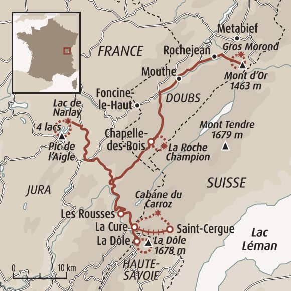 Morond, jusqu'au point culminant du Doubs. Là-haut, un panorama exceptionnel s'offre sur la Suisse, les grands lacs et les Alpes.