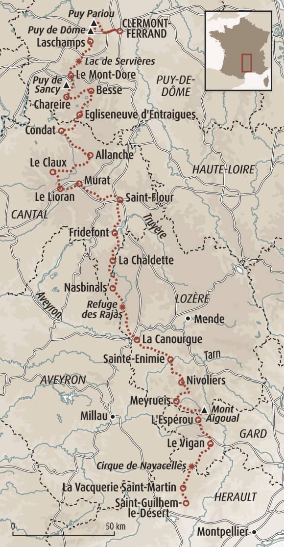 Depuis les volcans de la chaîne des Puys et les pentes du Sancy, nous entrons progressivement dans l’immensité des plateaux auvergnats, du Cézallier aux reliefs cantaliens. Les estives, burons et vallées profondes de la Truyère ouvrent la voie vers l’Aubrac, vaste territoire de silence et de lumière, où l’on marche au rythme du vent et des horizons dégagés. Plus au sud, les paysages se transforment : gorges encaissées, causses arides, villages de pierre et passages du Tarn et de la Vis. Le Causse Méjean, le Mont Aigoual et le cirque de Navacelles marquent les dernières étapes avant l’arrivée à Saint-Guilhem-le-Désert, entre héritage médiéval et premières senteurs méditerranéennes.
