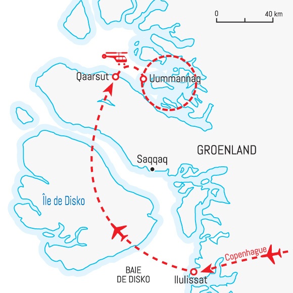 Depuis Copenhague vol vers le Groenland direction Kangerlussuaq pour une courte escale avant de reprendre un vol pour Ilulissat. Le lendemain nous nous envolons pour Qaarsut. Notre acheminement se terminera par un vol en hélicoptère jusqu'à Uummannaq.