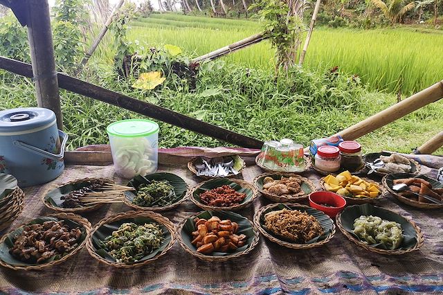 Pendant ce voyage, la majorité des repas sont inclus, sauf certains repas dans le Sud de Bali et pendant le séjour balnéaire à Nusa Lembongan, où les restaurants sont nombreux et variés. Les repas sont pris dans des restaurants locaux, ou sous forme de pique-nique.