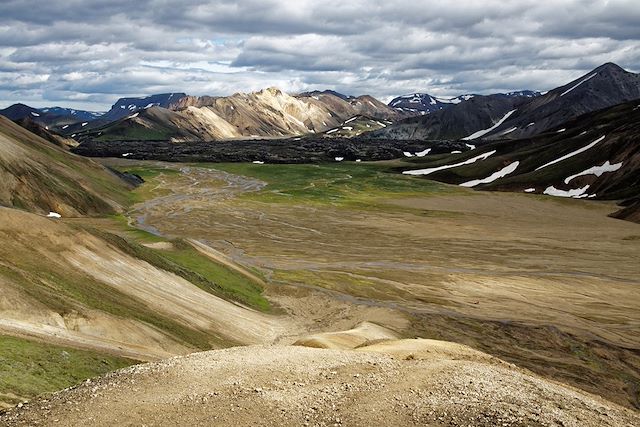 Aujourd'hui, nous nous tournons vers l'intérieur des terres, les highlands. Cette région centrale d'Islande est la plus sauvage et la plus minérale. Inaccessible en période hivernale, elle est ouverte quelques mois en été. Après avoir croisé le volcan Hekla, nous prenons une piste de montagne pour arriver dans la région du Fjallabak, aux portes des volcans colorés d'Islande.. Dans l'après-midi, le guide nous emmenera pour une rando facile vers la cascade de Raudufossar (les chutes rouges). Aujourd'hui également, nous changeons d'hébergement, nous arrivons à Landmannahellir, et ses petits chalets posés dans la lande. Ambiance bout du monde garantie !