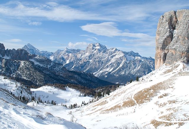 Après un transfert de 40 minutes jusqu’au col de Valparola, nous commençons notre randonnée en raquettes dans les alpages de Pralongià, à la frontière entre l’Alta Badia et Cortina d'Ampezzo. Nous faisons une boucle sur le plateau avant de revenir au point de départ.