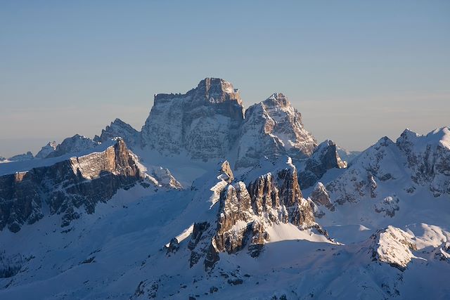 Départ vers le col Falzarego (40 minutes de route) pour cette randonnée célèbre dans les Dolomites. Nous montons en téléphérique jusqu’au refuge de Lagazuoi, puis nous randonnons en raquettes jusqu’au pic du même nom. Nous découvrons des vestiges de la Première Guerre mondiale avant de faire une boucle en passant par le petit lac Lagazuoi, puis retour par le téléphérique.