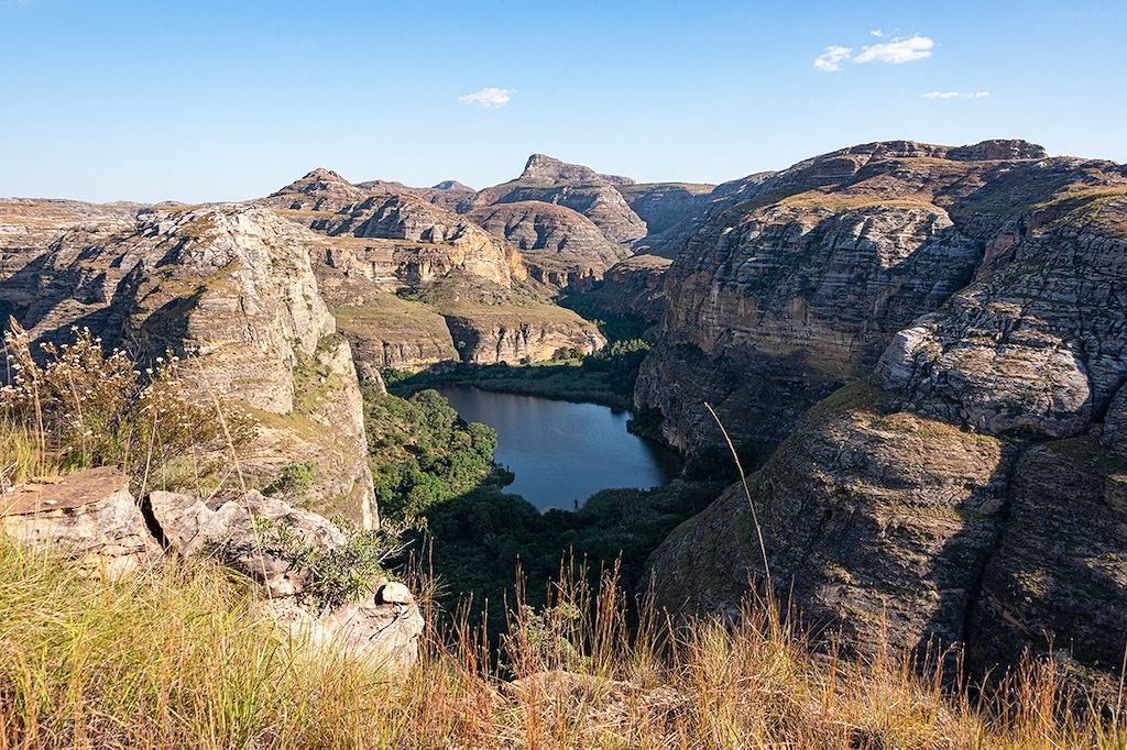 Début de la randonnée accompagnée par les équipes locales, tous natifs de la région. Nous empruntons des petits sentiers bien tracés par le passage régulier des bergers et leur troupeau. L'occasion pour nous de peut être rencontrer des lémuriens et des oiseaux… L’avancée se fait à travers des buissons de hautes herbes sur quelques kilomètres, déjeuner pique nique au bord d’une petite rivière. L’après midi nous continuons la randonnée à travers des canyons. Nous arrivons au campement vers 16h et nous profitons de la dernière heure du jour pour les photos et la détente. Dîner.