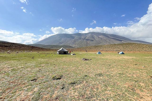 Tôt le matin, départ de Marrakech en minibus par la route qui longe les contreforts nord du Haut Atlas, passage à Azilal (arrêt visite d’un musée archéologique) poursuite via Aït Mohamed. Pique-nique en chemin puis poursuite par la route de montagne en direction Tizi n'tighist, ancien col caravanier au pied de l’Azourki, arrivée au fond de la vallée des Bougumez. Rencontre avec votre équipe de muletiers, début de la randonnée pour rejoindre le site du lac asséché d’Izourar. Installation du campement pour 2 nuits à 2500m d’altitude sur le plateau d'Izourar où vous croiserez de nombreux troupeaux.