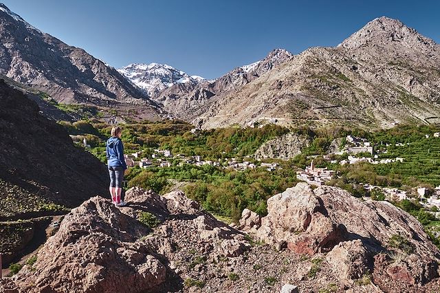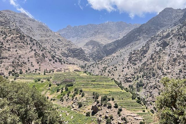 Parcourir les vallées et cascades autour du Toubkal, c’est s’immerger dans une montagne où pâturages, villages berbères et forêts d’altitude se succèdent au fil des jours. Ce voyage s’adresse aux marcheurs qui souhaitent une randonnée bien rythmée, ponctuée de paysages verdoyants, de cultures en terrasses et de passages ombragés. Depuis Marrakech, nous gagnons Imlil pour une première balade sous les noyers, avant d’entrer dans la vallée d’Azaden et ses contreforts spectaculaires dépassant les 3000 m. Au programme : cols, alpages et cascades où l’eau anime la montagne, des gîtes confortables aux nuits sous tente installées par l’équipe logistique. Des moments simples mais intenses, entre nature brute et culture berbère, qui font de cette itinérance une découverte du Haut Atlas central.
