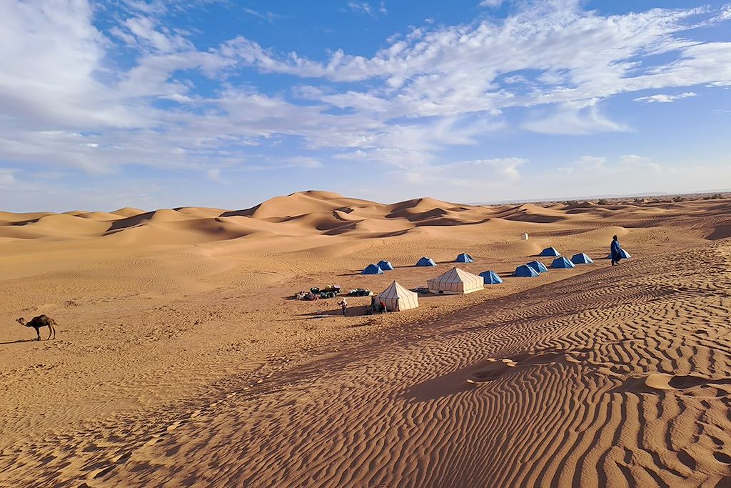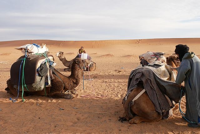 Les confins marocains, c'est l’espace des nomades, Aït Atta ou Reguibats, celui du Sahara, et des anciennes caravanes. Le long du Drâa, les oasis de Zagora, Taggounit, Ouled Driss, M’Hamid sont les parfaites oasis sahariennes : palmeraies verdoyantes s'étirant sur des kilomètres, sur fond de plateaux et de dunes. Avec votre équipe chamelière une randonnée de 6 jours intenses entre dunes, hamadas et lac asséché. Des noms qui psalmodient cette longue histoire du désert : erg Ait Oumir, erg Smar, djebel Bani, oued El Attach... avec la Grande Ourse pour éclairer vos nuits. Une belle expérience saharienne.