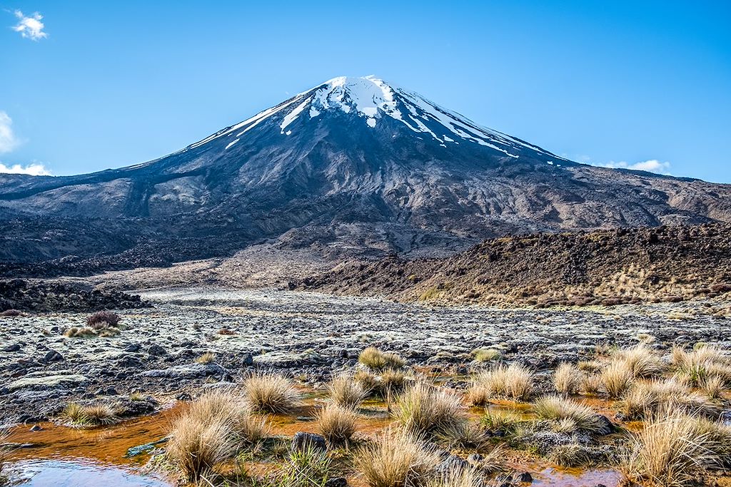 Nous prenons un ferry tôt le matin pour rejoindre l’île du Nord (3h de traversée). La navigation dans le détroit de Cook offre de superbes points de vue, notamment lors de la sortie des Marlborough Sounds, où les collines boisées plongent dans la mer. À notre arrivée à Wellington, la capitale néo-zélandaise, nous faisons une pause pour le déjeuner et une courte balade dans le centre-ville. Nous poursuivons ensuite notre route vers le parc national du Tongariro. Le trajet traverse de vastes paysages ruraux, alternant collines verdoyantes, plateaux ouverts et forêts. Peu à peu, les reliefs volcaniques se dessinent à l’horizon. Le mont Ruapehu apparaît en premier, suivi du cône parfait du mont Ngauruhoe, puis du massif du Tongariro. Nous entrons dans l’un des territoires volcaniques les plus emblématiques du pays, où les silhouettes minérales dominent les grands espaces.