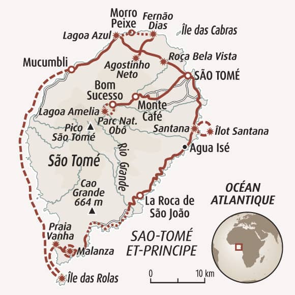 - J3 et J4 : Praia Vanha, un véritable coin de paradis caché entre forêt luxuriante et océan Atlantique. Située à Praia Vanhá, dans le sud préservé de São Tomé, ces éco bungalows de charme se situent au cœur d’une plantation certifiée BIO de vanille et de plantes aromatiques.
