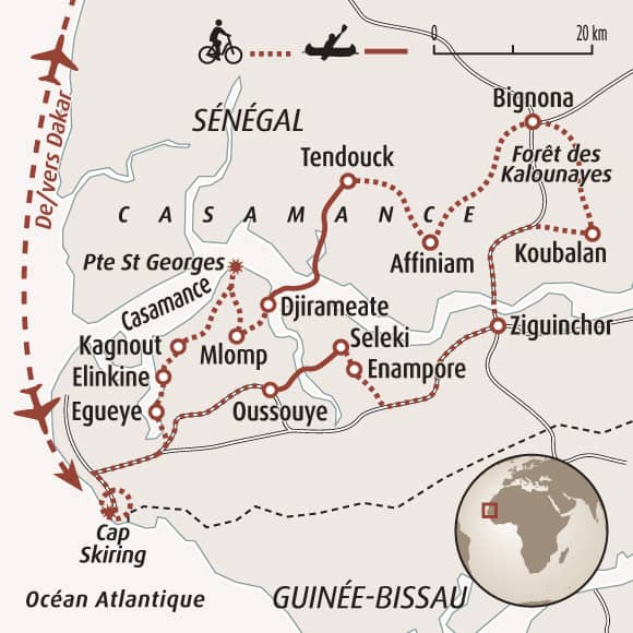 Départ à vélo à travers la région du Bandial, parsemée de villages diolas. À Ziguinchor, découverte du quartier colonial et du port où l’on fabrique encore des pirogues traditionnelles. Dans l’après-midi, traversée du fleuve Casamance pour rejoindre Koubalan, village de brousse où hospitalité et traditions se partagent autour d’un repas convivial.