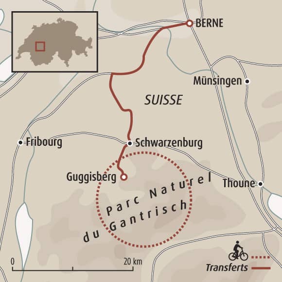 Pour cette dernière matinée, nous laissons derrière nous le charme montagnard de Guggisberg et partons à la découverte d’un parcours alternant chemins forestiers, prairies alpines et petites routes de campagne. Cette étape nous offre de magnifiques panoramas sur les collines du Gantrisch. Les sentiers, à la fois roulants et techniques par moments, constitueront un dernier défi avant de clore le séjour.