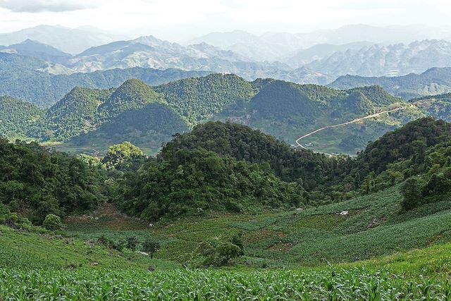 Le matin, transfert en direction de Tan Lap, qui sera le point de départ de notre randonnée sur le contrefort nord-ouest du mont Muon Nao (1375m). Notre marche débute par une montée progressive sur le sommet d'une colline qui surplombe la vallée rizicole de Ta Phenh, encadrée de hautes montagnes calcaires. Cheminement à travers cette vallée, puis continuation le long d'un petit sentier bétonné qui gravit la montagne et mène à un secteur plus sauvage. C’est une succession de montées et de descentes qui permet de découvrir un territoire abrupt et préservé. Malgré ce relief tourmenté, les habitants y cultivent maïs et légumes. Une descente douce nous conduit ensuite dans une vallée étroite, couverte de pruniers. En février, leur floraison offre un véritable spectacle. Traversée de cette vallée et poursuite de la marche jusqu’au point de rendez-vous avec le chauffeur. Retour à la maison d’hôtes.